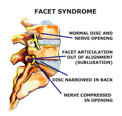 - Facet Syndrome (also called Facet Arthropathy or Facet Imbrication) – This refers to the jamming of the posterior facets of the spinal column causing inflammation, pain and ultimately degeneration. Loss of disc height often leads to facet compression so therapy is usually directed at disc rehabilitation, but posture often needs to be addressed.